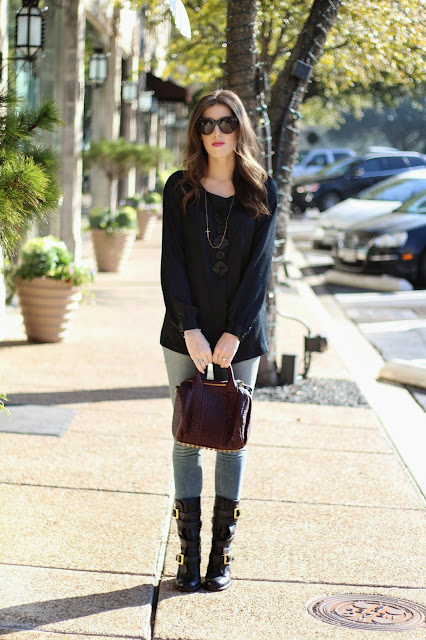 Camel has been the "in" color this (or last) season, and I haven't really jumped on the bandwagon, primarily because I think camel, as a color, looks horrific on me. BUT I will say that I think there is something so casual chic about accessorizing an all black ensemble with a rich caramel color. I love the way my booties and LV bag complement the black, and I feel like such a "cool girl".